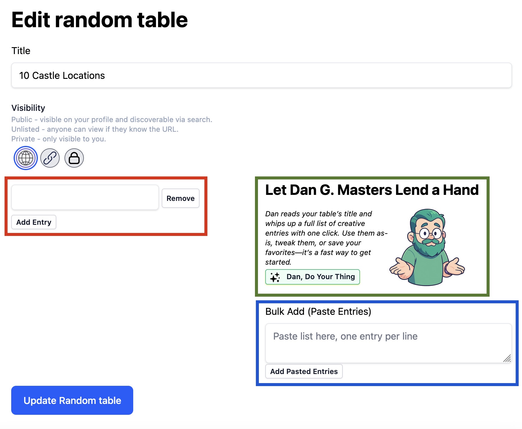 Make a new Random Table and give it a descriptive name and a unique slug.